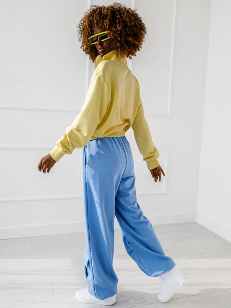 Pants with wide legs and pockets, combine comfort with functionality.