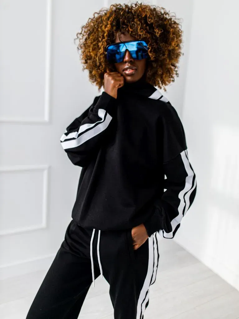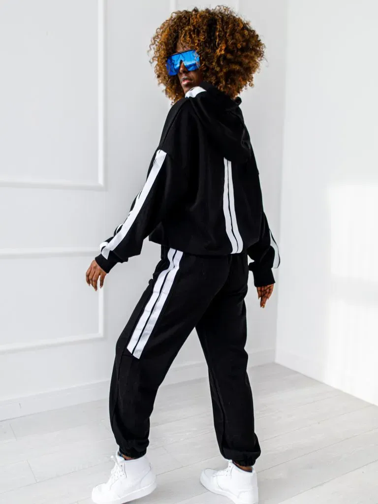 A hoodie provides comfort on colder days, and the stripe along the sleeves and legs adds a modern touch to the whole.