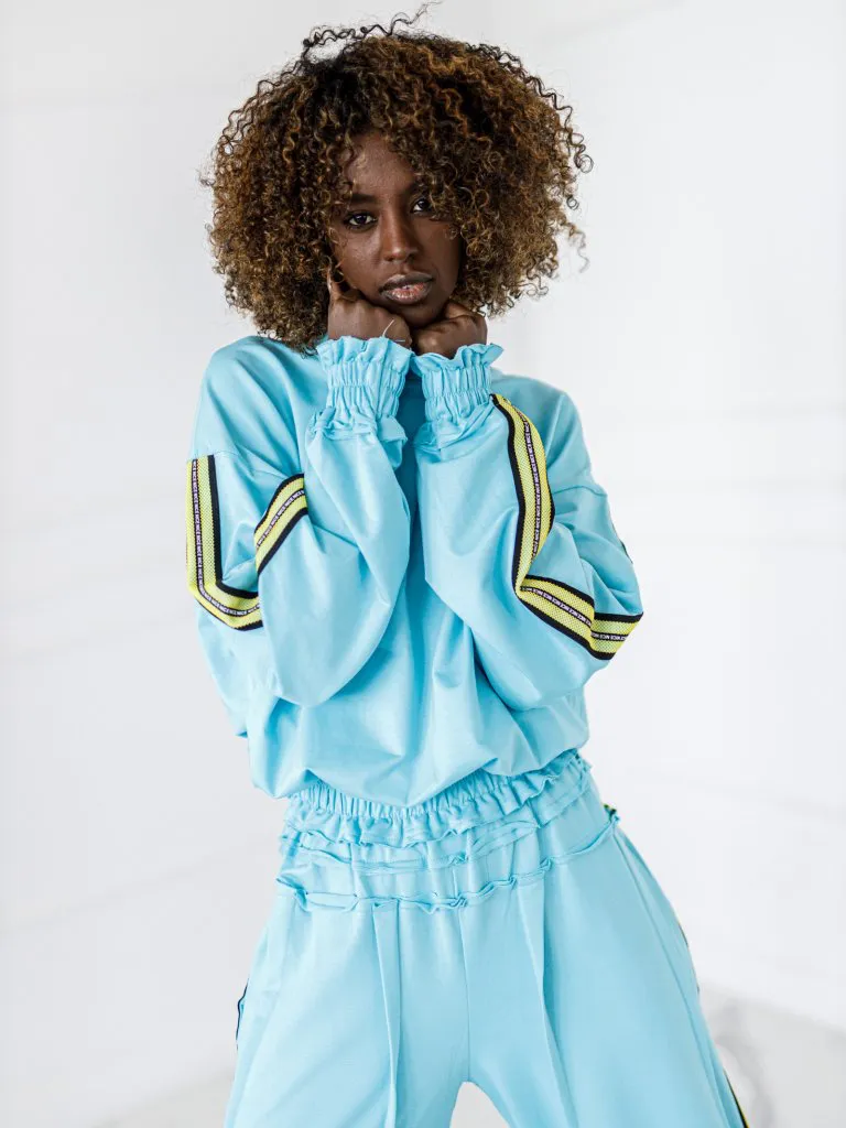 Wygodny komplet z luźną bluzą i szerokimi spodniami z efektownymi lampasami.