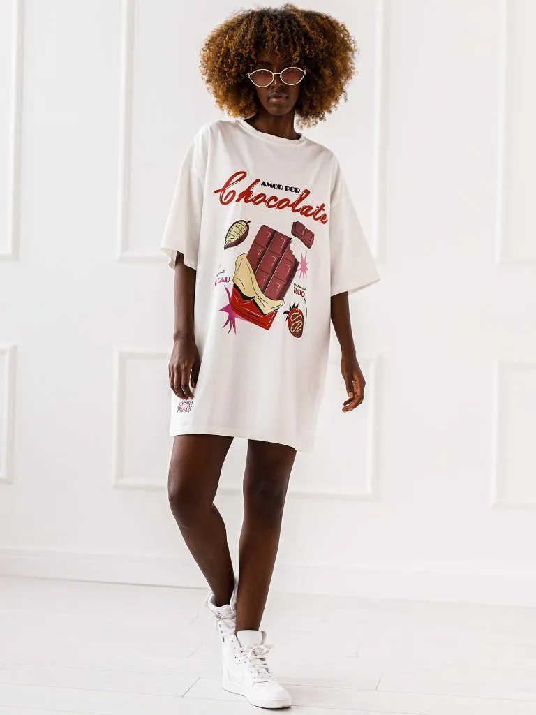 Oversize’owy T-shirt z zabawnym nadrukiem inspirowanym miłością do czekolady.