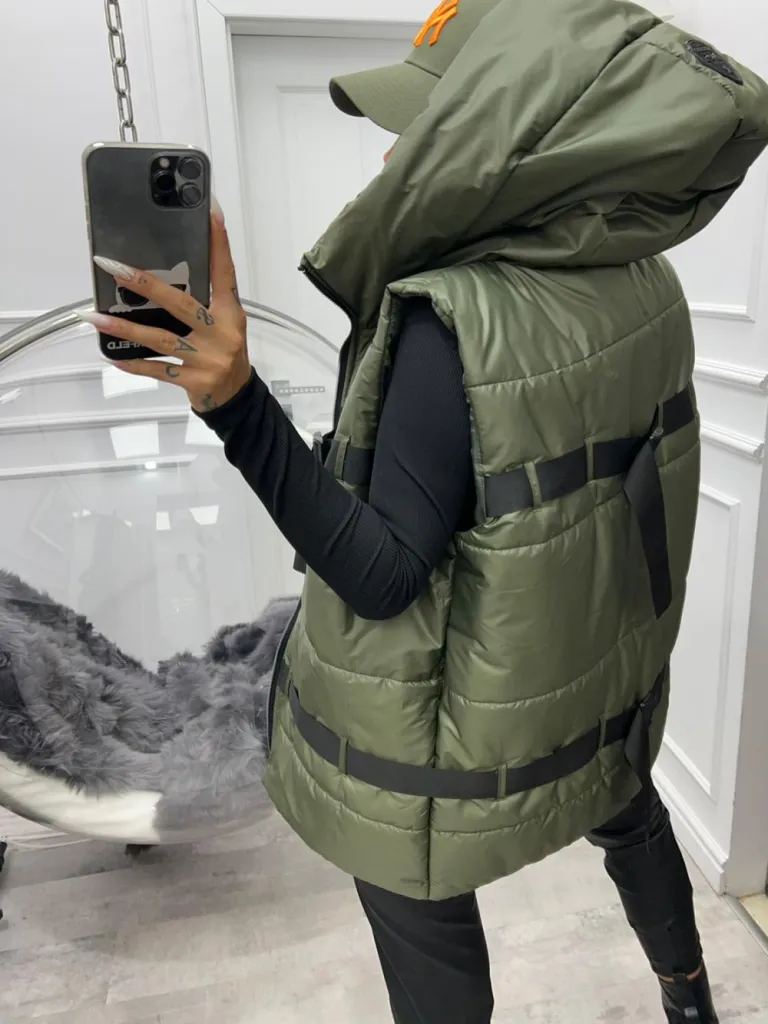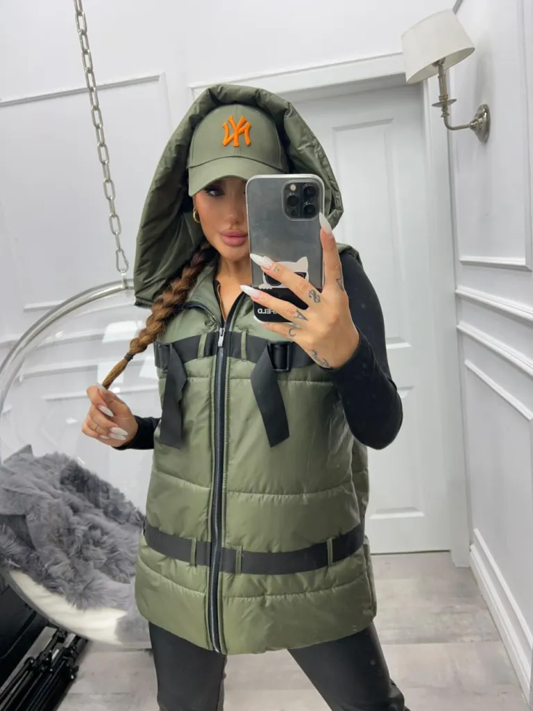 Женский жилет классического кроя без рукавов с лентами. Застегивается на молнию, имеет капюшон и два кармана. Польское производство. Размер S/ML/XL. Разные цвета.